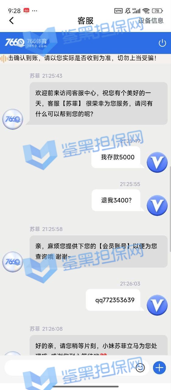2、鉴黑担保网维权专员了解到此会员在PA真人游戏里面投注,提款迟迟未到账,会员联系平台客服得到的回复是投注过程中存在违规行为,故扣除部分金额退回3400元后冻结账号。