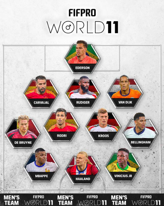 2024年FIFPRO年度最佳11人评选结果揭晓,金球奖得主罗德里领衔,姆巴佩、哈兰德、维尼修斯组成锋线。